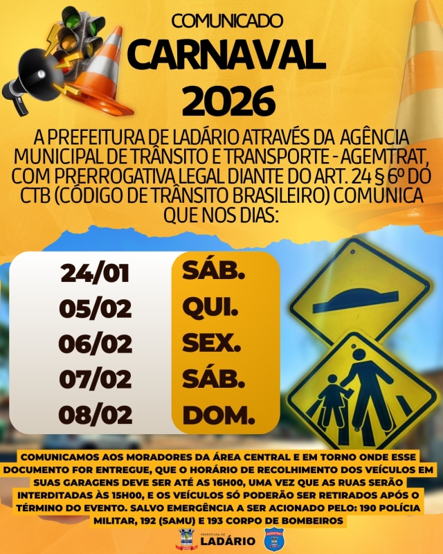 Prefeitura de Ladário, por meio da Agência Municipal de Trânsito e Transporte (AGEMTRAT), divulgou comunicado oficial informando sobre interdições de vias na região central do município durante a realização do Carnaval 2026. A ação segue prerrogativa legal prevista no artigo 24, §6º, do Código de Trânsito Brasileiro (CTB).