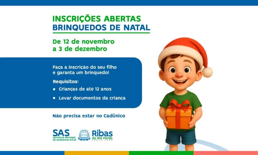 A Prefeitura de Ribas do Rio Pardo, por meio da Secretaria Municipal de Assistência Social, informa que as inscrições para a entrega de brinquedos de Natal estarão abertas de 12 de novembro a 3 de dezembro.
