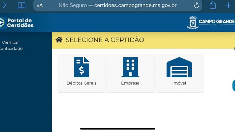 Para retirar as certidões é preciso acessar o site no endereço certidoes.campogrande.ms.gov.br fazer o cadastro no portal e escolher o serviço desejado. No portal é possível retirar certidões negativas de serviços da Prefeitura para pessoa física, jurídica e imobiliário. Ainda no Portal é possível verificar a autenticidade das certidões emitidas clicando no ícone “Verificar Autenticidade” e digitando o número da certidão e do código de autenticidade que está escrito na própria certidão.