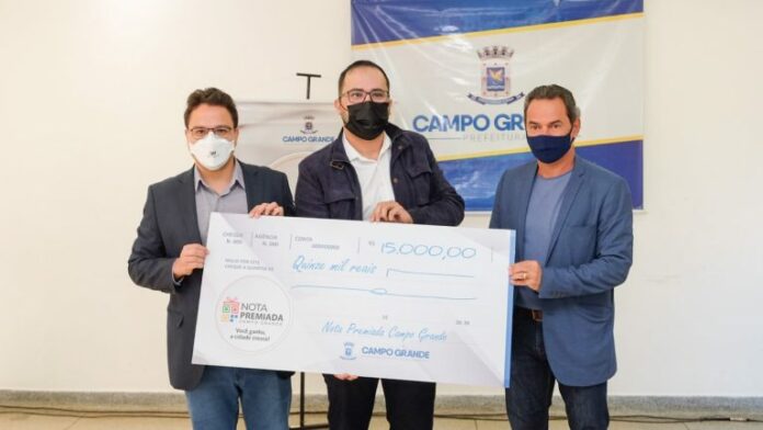 A Prefeitura de Campo Grande entregou nesta quinta-feira (22) R$ 70 mil em prêmios do 5º sorteio da Nota Premiada Campo Grande/2021. O primeiro prêmio, de R$ 50 mil, ficou para Sohane Karoline de Souza Gomide de Carvalho, e o segundo prêmio, de R$ 15 mil, para José Conceil Pereira Durães.