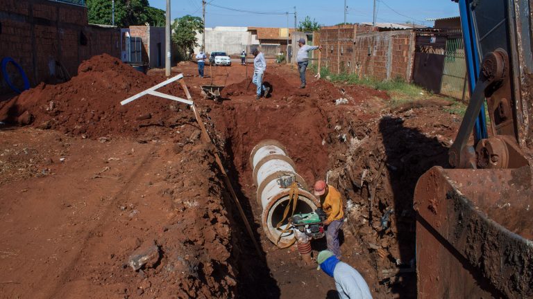 Já na Rua Três Marias, que já recebeu 1 km de tubulação, as equipes estão trabalhando na terraplanagem e base antes de receber o asfalto. Esta drenagem, que começa perto do Condomínio Sett Village e termina na Avenida Tamandaré, será o canal por onde vai escoar a água até pluvial até o Córrego Frutuoso, não só do Bosque da Saúde, mas também do Bairro Nossa Senhora das Graças.