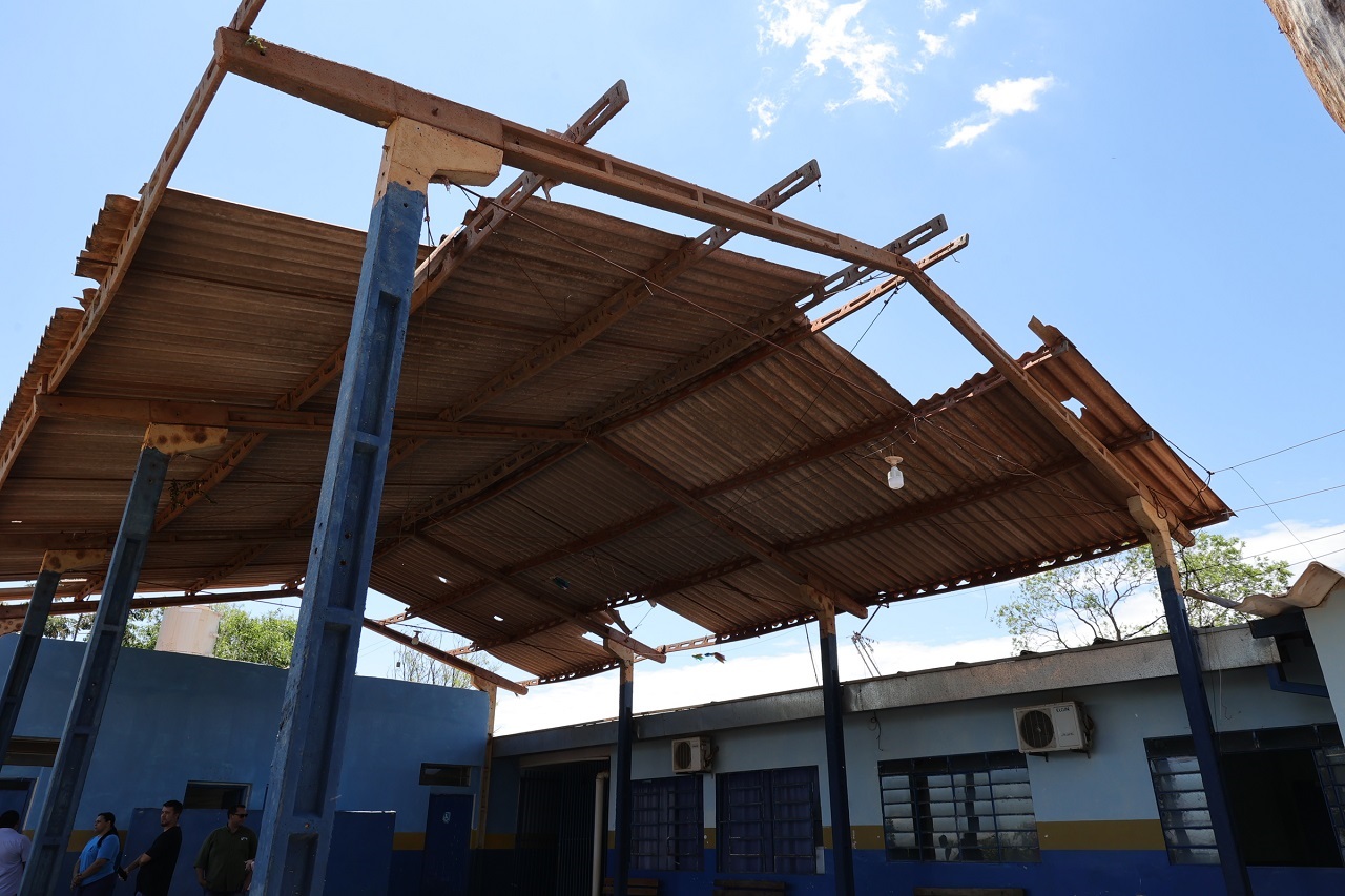 O alambrado da quadra de esportes tombou, um poste de iluminação caiu e várias árvores ao redor da escola foram arrancadas pela força do vento. Além disso, a fiação elétrica da unidade foi comprometida e precisará ser substituída.