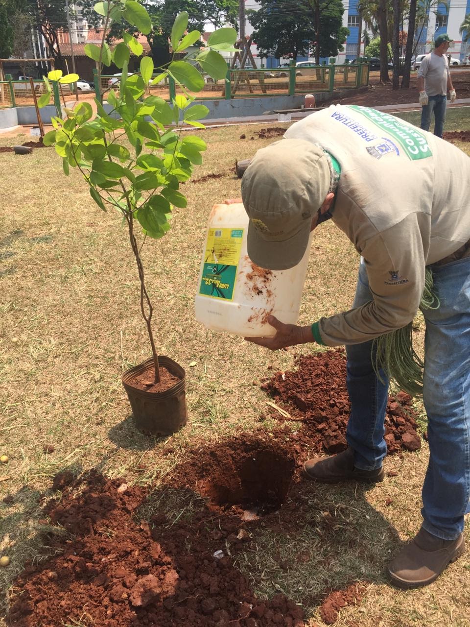 Por conta do atual período de estiagem, os plantios estão sendo realizados em etapas e os cuidados com a manutenção das mudas estão sendo redobrados, inclusive, durante o plantio, é feita a aplicação de um gel que auxilia na capacidade de retenção e reserva de água para as plantas, além de adubos e demais cuidados necessários.