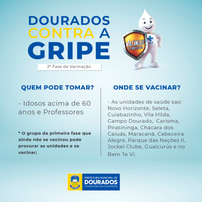 A Prefeitura de Dourados continua com a campanha de vacinação contra influenza nos postos de saúde da cidade. Nesta etapa, a imunização está direcionada para idosos com mais de 60 anos e professores. As unidades de saúde urbanas, que estão vacinando contra influenza, são: Novo Horizonte, Seleta, Cuiabazinho, Vila Hilda, Campo Dourado,  Carisma, Piratininga, Chácara dos Caiuás, Maracanã, Cabeceira Alegre, Parque das Nações II, Jockei Clube, Guaicurús e no Bem Te Vi.