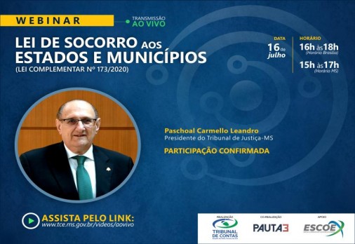 O presidente do Tribunal de Justiça de Mato Grosso do Sul, Des. Paschoal Carmello Leandro, é um dos convidados especiais do Webinar Lei de Socorro aos Estados e Municípios (LC 173/2020), promovido pelo Tribunal de Contas de MS (TCE-MS). O evento será transmitido pelo link www.tce.ms.gov.br/videos/aovivo na quinta-feira, dia 16 de julho, das 15 às 17 horas.