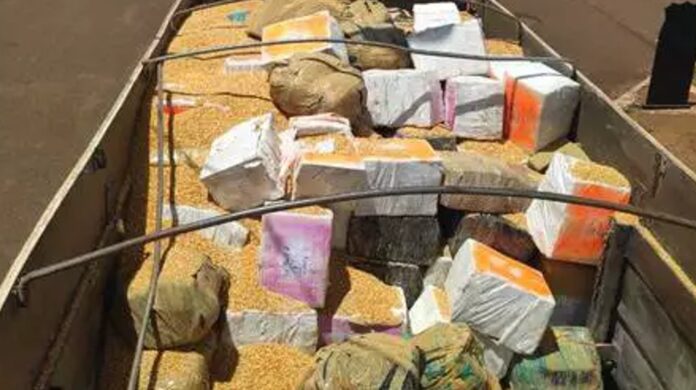 O veículo foi abordado após monitoramento durante a Operação Cavalo de Troia. Durante a vistoria, os policiais localizaram os tabletes de maconha escondidos entre os grãos.