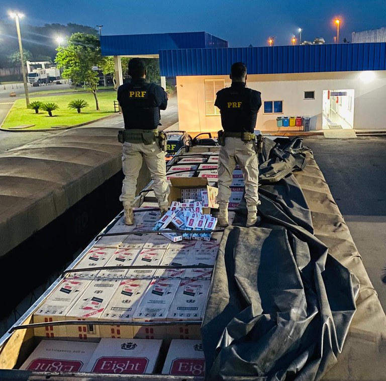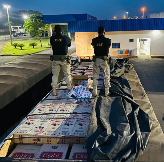 Uma carga com 450 mil maços de cigarros contrabandeados do Paraguai foi apreendida pela Polícia Rodoviária Federal (PRF) na madrugada de hoje (17).