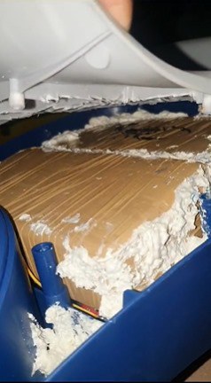Nas bagagens dela, havia um carrinho de rolimã e uma lata grande de leite em pó. Dentro destes, foram encontradas drogas.