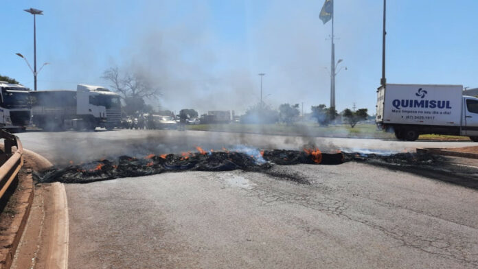 Durante a manhã desta sexta-feira, um grupo de manifestantes bolsonaristas organizou uma barricada de pneus no Trevo da Bandeira, impedindo o fluxo de veículos. Eles também atearam fogo nos pneus para impedir os avanços, em uma dessas investidas um veículo, modelo Fiat Uno, acabou pegando fogo ao furar o bloqueio. Por sorte, ninguém se feriu.
