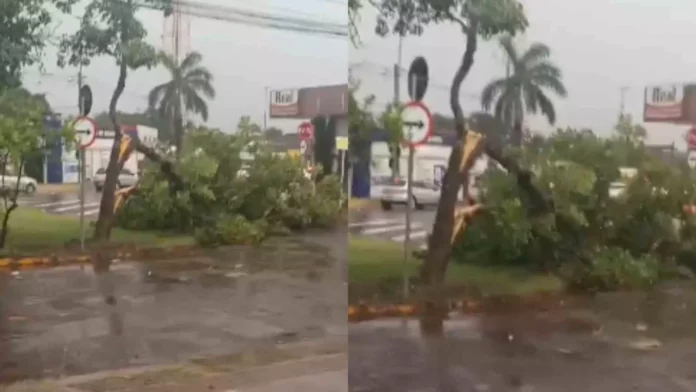 Entre os estragos está uma queda de árvore, de grande porte, no cruzamento da Rua João XXIII com a Rua Pacaembu, próximo à Avenida Eduardo Elias Zahran.