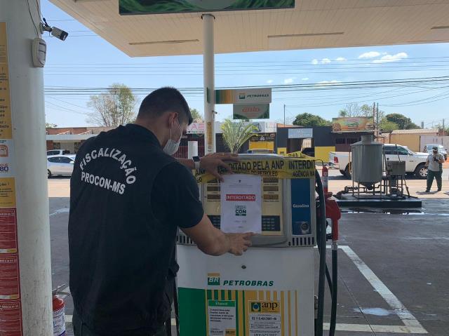 Em operação conjunta entre Procon Estadual e Agência Nacional de Petróleo (ANP), fiscais suspenderam abastecimento de etanol em posto de combustível localizado na avenida José Nogueira Vieira, bairro Tiradentes, em Campo Grande, devido produto estar fora de especificações técnicas. A fiscalização chegou até o local depois de receberem denúncias de consumidores.