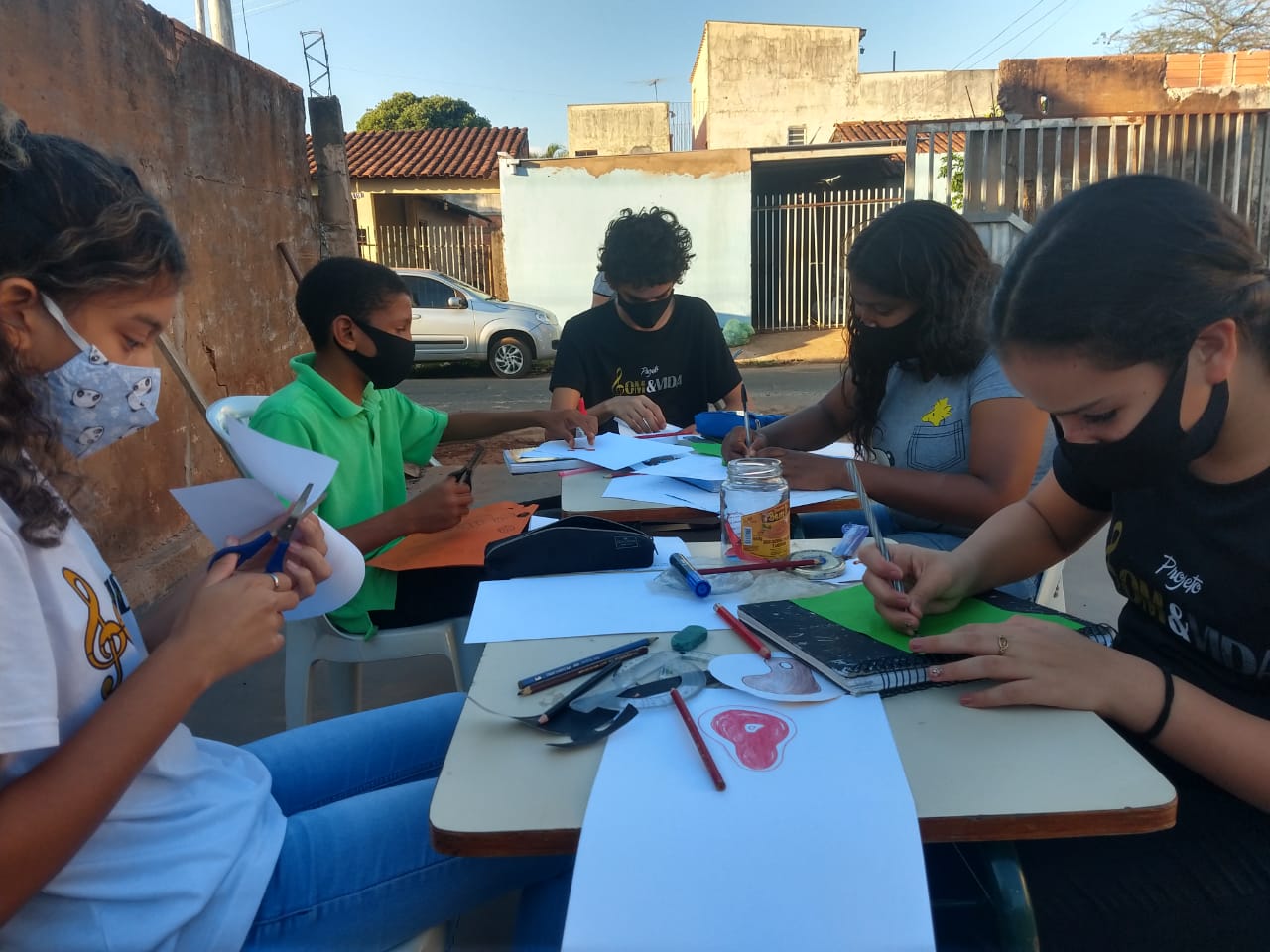 Cibelle e alunos da ONG Som e Vida durante a produção do vídeo “Goteira Musical”