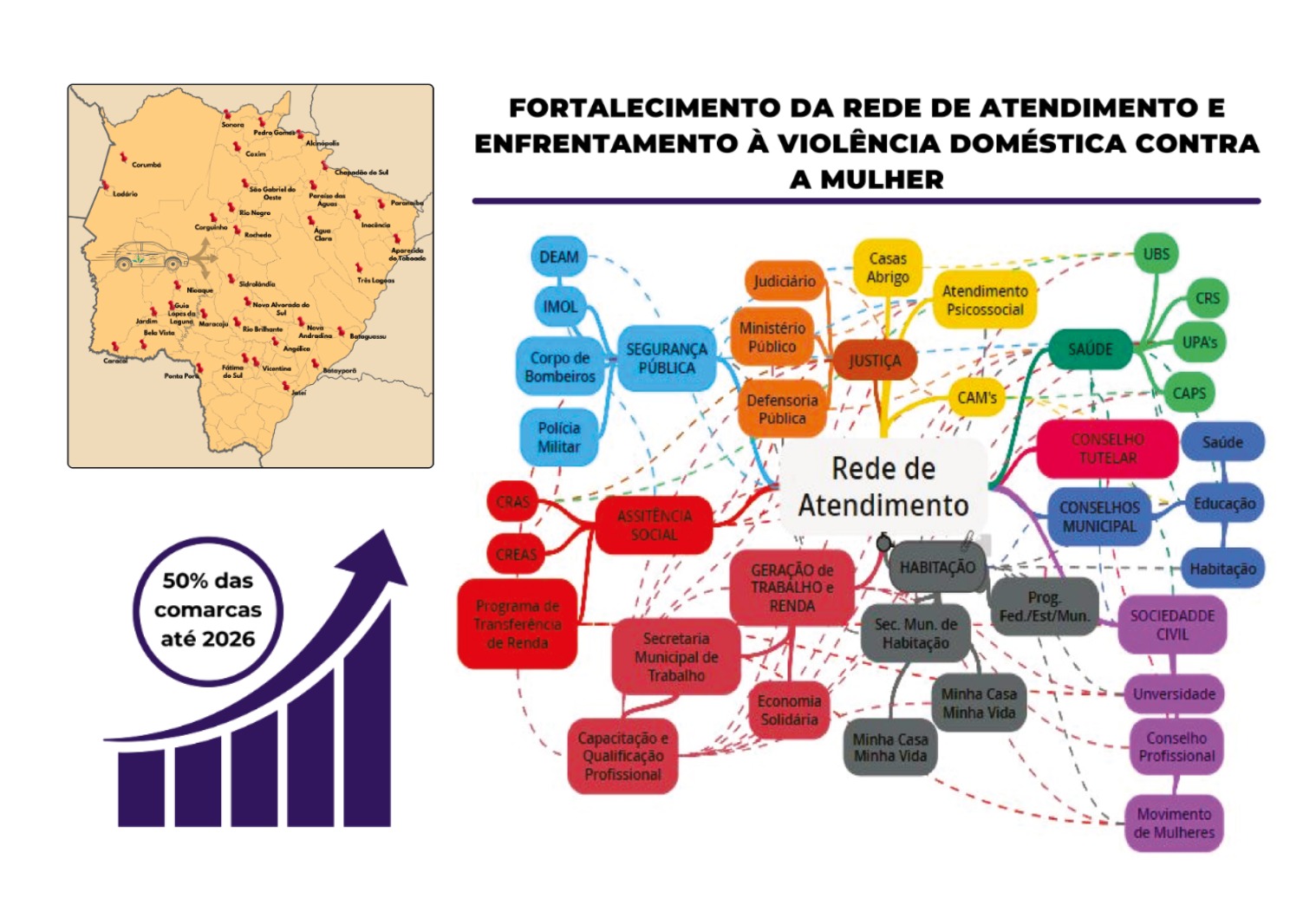 Com esse objetivo, o Tribunal de Justiça de Mato Grosso do Sul, por meio da Coordenadoria Estadual da Mulher em Situação de Violência Doméstica e Familiar, desenvolve o Programa de Fortalecimento da Rede de Atendimento e Enfrentamento à Violência Doméstica. Criado em 2017 e regulamentado pela Portaria nº 1.346/2018, o programa já beneficiou 34 municípios e capacitou mais de 1.500 profissionais desde sua criação.