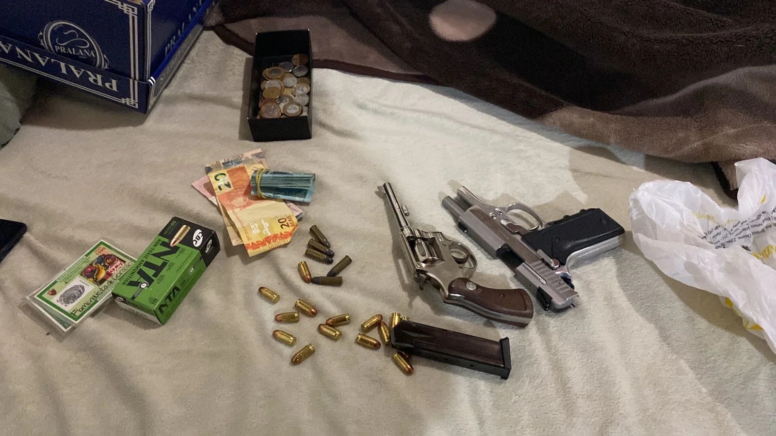 Também foram apreendidas duas armas, sendo um revolver calibre 38 e uma pistola calibre 38, bem como munições, e droga. Um homem que nõa estava entre os alvos foi preso em flagrante por tráfico.