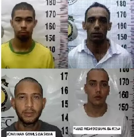 A Agepen divulgou a foto dos detentos e continua pelas buscas. Jonathan Gomes da Silva é conhecido como “Barata”, André Cerdeira, o “Deco”, Djordan William Ribas da Cruz, o “Billy”, e Paulo Ricardo Silva da Rosa, o “Bombadinho”.