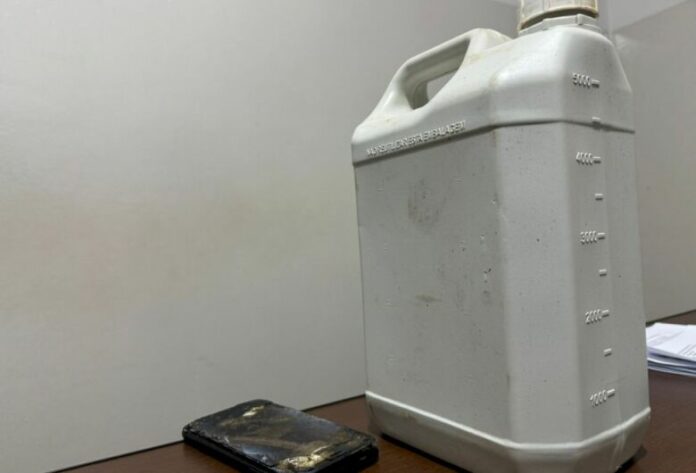 No local, os policiais identificaram chamas nas margens da via e encontraram um galão de cinco litros vazio com resquícios de gasolina, além de bolsa, blusa feminina, um aparelho celular queimado e uma blusa de moletom também queimada.