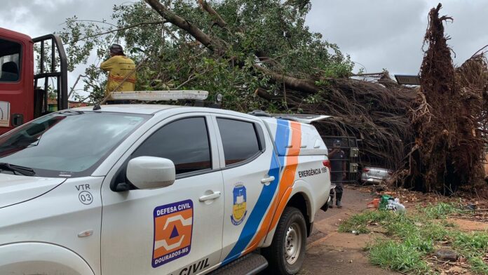 A Seringueira que caiu ontem (03), em Dourados, continua impedindo o fluxo de veículos na Rua dos Missionários, na região do bairro Jardim Paulista. Na manhã desta quarta-feira (04), operários da Prefeitura Municipal, da Defesa Civil e até do Corpo de Bombeiros trabalham na remoção dos galhos e do tronco.