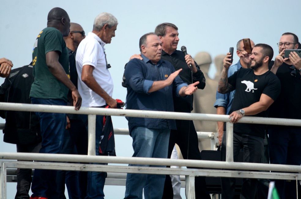 O ex-ministro da Saúde Eduardo Pazuello também compareceu ao evento neste domingo. Sem máscara, o general do Exército, na ativa, subiu em um carro de som e, ao lado de Bolsonaro, fez um breve discurso.