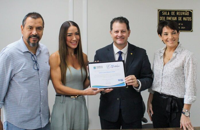 “Nossa homenagem é em reconhecimento pelos feitos da Tatiane, por ser uma atleta incrível, a verdadeira fonte de inspiração, que palmilhou uma trajetória de determinação, superação e excelência. Em nome da Assembleia Legislativa do Estado de Mato Grosso do Sul, da Fundesporte e do Instituto Emanuelle temos a honra e o privilégio de prestar esta justa homenagem” afirmou Renato Câmara ao entregar o diploma de sua autoria e parabenizar Tati Bérgamo.