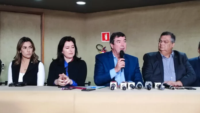 Sul-mato-grossenses senadora por MS, Soraya Tronik, ministra Simone Tebet e governador Eduardo Riedel. Ministro Flávio Dino