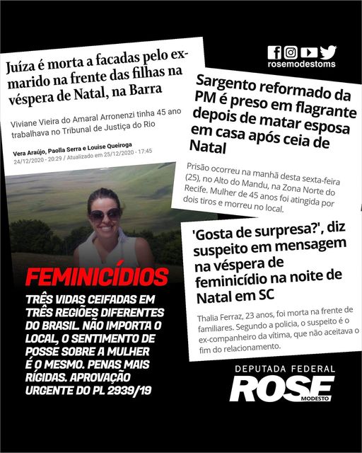 A morte da juíza Viviane Arronenzi pelo ex-marido e de outras cinco mulheres vítimas de feminicídio em todo o Brasil no feriado de Natal motivaram a deputada federal sul-mato-grossense Rose Modesto (PSDB-MS) a reforçar o pedido de urgência nas votações dos Projetos de Lei 1568/19 e 2939\19, de sua autoria, que aumenta a pena mínima para o feminicídio de 12 para 20 anos. As proposições estão sendo apreciadas na Comissão dos Direitos da Mulher (CMulher) da Câmara dos Deputados.