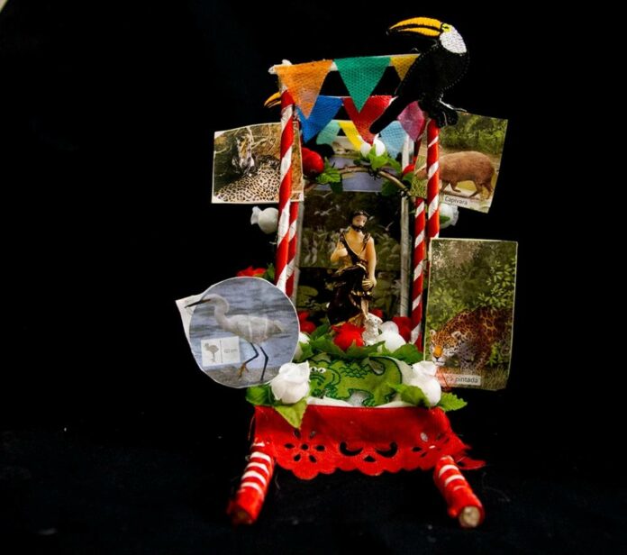 Na confecção do mini andor, Neyr Concho Pereira utilizou os seguintes materiais: fitas nas cores vermelho, branco e verde, imagens de animais do pantanal e flores nas cores vermelho e branco.