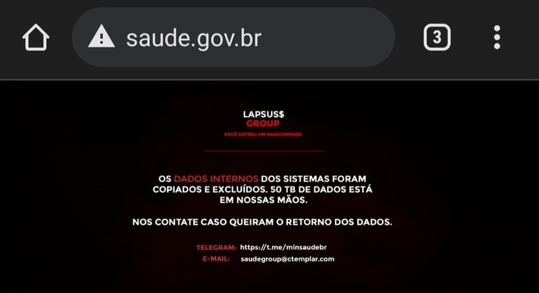 Na sexta-feira, ao tentar acessar o portal da pasta da Saúde, os usuários se depararam com a seguinte mensagem: “Os dados internos dos sistemas foram copiados e excluídos. 50 TB (Terabyte) de dados está (sic) em nossas mãos.” Ainda de madrugada, o informe do grupo ficou indisponível. As plataformas contudo, seguem fora do ar.