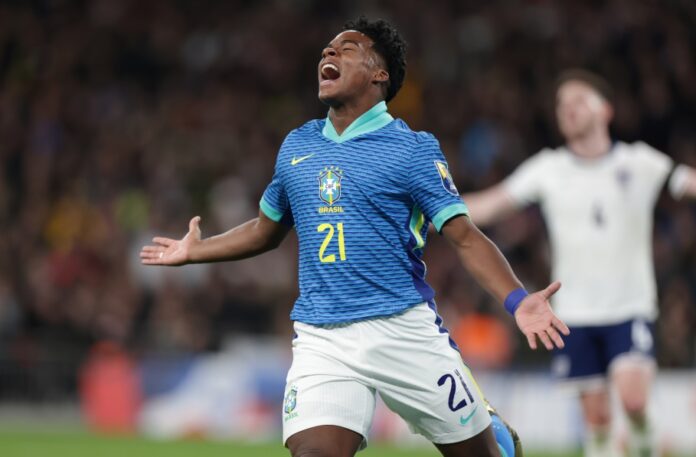 Endrick comemora o gol da vitória do Brasil sobre a Inglaterra (Foto: Rafael Ribeiro/CBF)