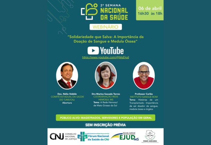 No dia 6 de abril, o Comitê Estadual de Mato Grosso do Sul do Fórum Nacional da Saúde do CNJ, coordenado pelo desembargador Nélio Stábile, em parceria com a Ejud-MS, realizará o webinário “Solidariedade que Salva: A Importância da Doação de Sangue e Medula Óssea”. O evento ocorrerá das 16h30 às 18 horas, com transmissão pelo canal da Ejud-MS no YouTube. Acesse o Webinário aqui.