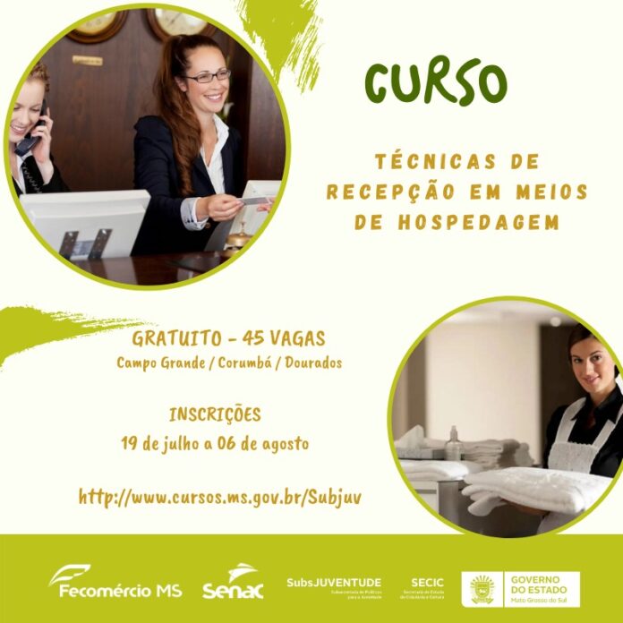 Por meio do programa “Capacita Juventude”, que qualifica jovens em diversos municípios de Mato Grosso do Sul, o Senac MS e a Subsecretaria de Estado de Políticas Públicas para Juventude oferecem 45 vagas para qualificação gratuita no curso Técnicas de Recepção em Meios de Hospedagem. As vagas são para os municípios de Campo Grande, Corumbá e Dourados.