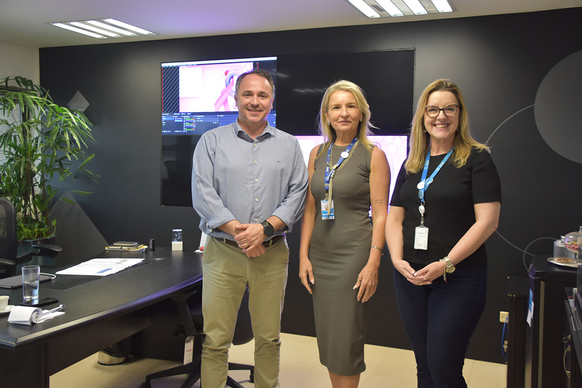O diretor-regional do Senai, Rodolpho Caesar Mangialardo, e a gerente de educação do Senai, Dani Gil, receberam, na segunda-feira (07/10), a gerente da rede de cuidados à pessoa com deficiência na Secretaria Estadual de Saúde (SES), Juliana Medeiros. Na reunião, foram debatidas parcerias para investimentos em instituições filantrópicas que atendem PCDs pro meio de programa do Ministério da Saúde