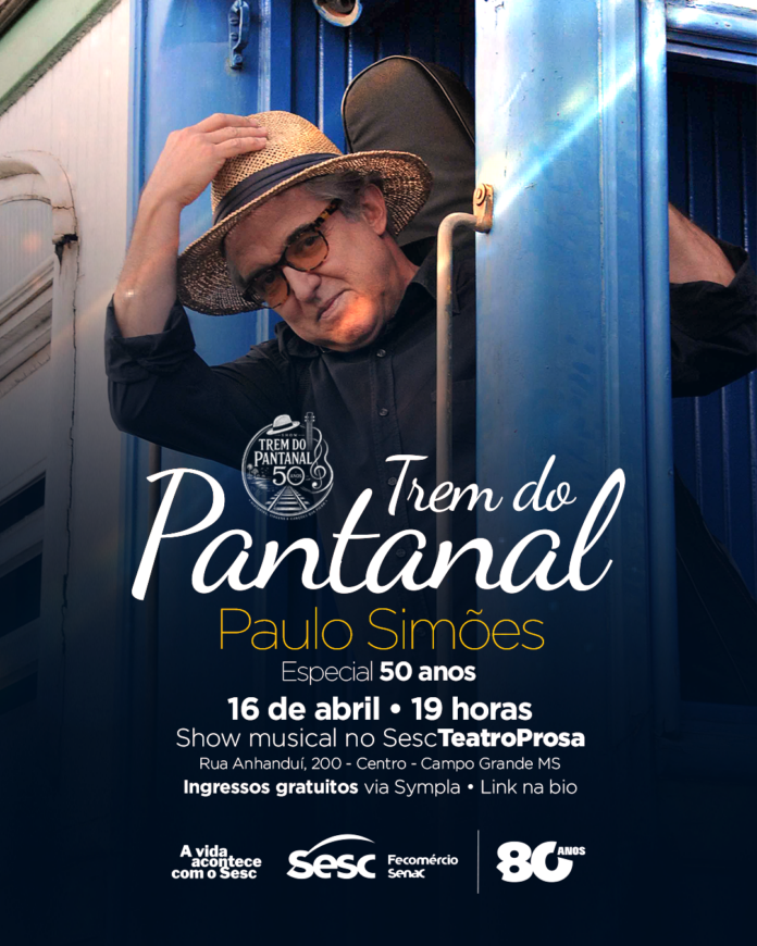O Sesc Teatro Prosa realiza no dia 16 de abril, às 19h, o show Trem do Pantanal | 50 Anos, com o artista Paulo Simões. O evento marca o início de uma retrospectiva da carreira do cantor e compositor, celebrando o legado de uma das músicas mais emblemáticas da cultura sul-mato-grossense.