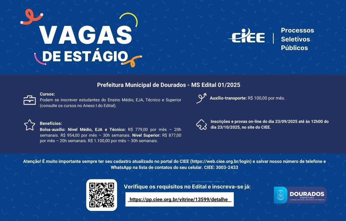 A Prefeitura de Dourados e o Centro de Integração Empresa-Escola (CIEE) estão com um processo seletivo para contratar estagiários.