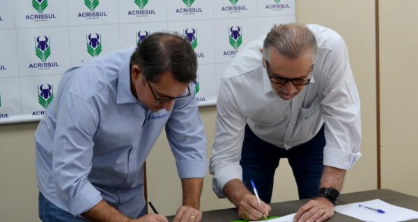 Presidentes da Acrissul, Guilherme Bumlai, e do Sicredi-Campo Grande, Vardes Lemos, assinam termo de parceria - Crédito: Acrissul