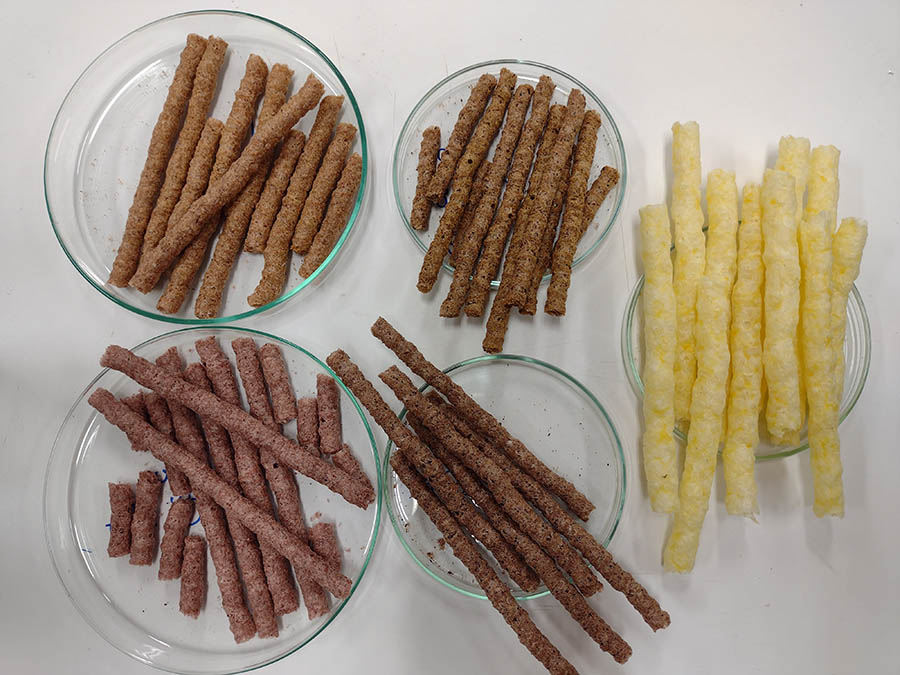 Os snacks salgados extrudados foram produzidos na Planta Piloto de Cereais da Embrapa Agroindústria de Alimentos, com farinhas integrais de sorgo com e sem tanino, adicionadas de cúrcuma, cominho e pimenta caiena em pó.