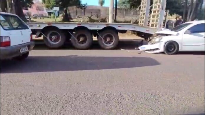 Um veículo, modelo VW Gol, ficou com a dianteira completamente destruída ao atingir o semirreboque de uma carreta na manhã dessa segunda-feira (26), em Campo Grande.