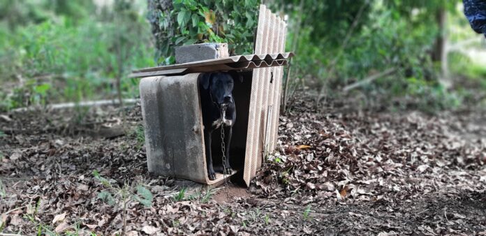 No local, os policiais constataram que o cão não dispunha de água potável em condições adequadas para consumo e nem de abrigo, uma vez que a pequena caixa d´água de amianto improvisada pelo tutor e destinada a tal fim, era desproporcional ao seu tamanho. O cão ficava exposto constantemente a todos os tipos de intempéries (frio, vento, chuva e calor etc), e era mantido segregado e amarrado à beira de mata ciliar que permeia a chácara, há pelo menos oito meses, como forma de alertar quanto à aproximação indesejada através da mata de eventuais criminosos.