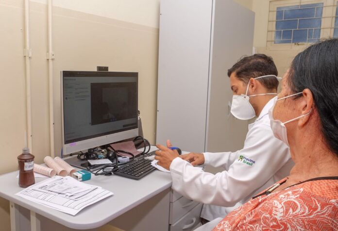 Médico da unidade de saúde durante atendimento a paciente com suporte do especialista. (Foto: Karine Matos/PMCG)