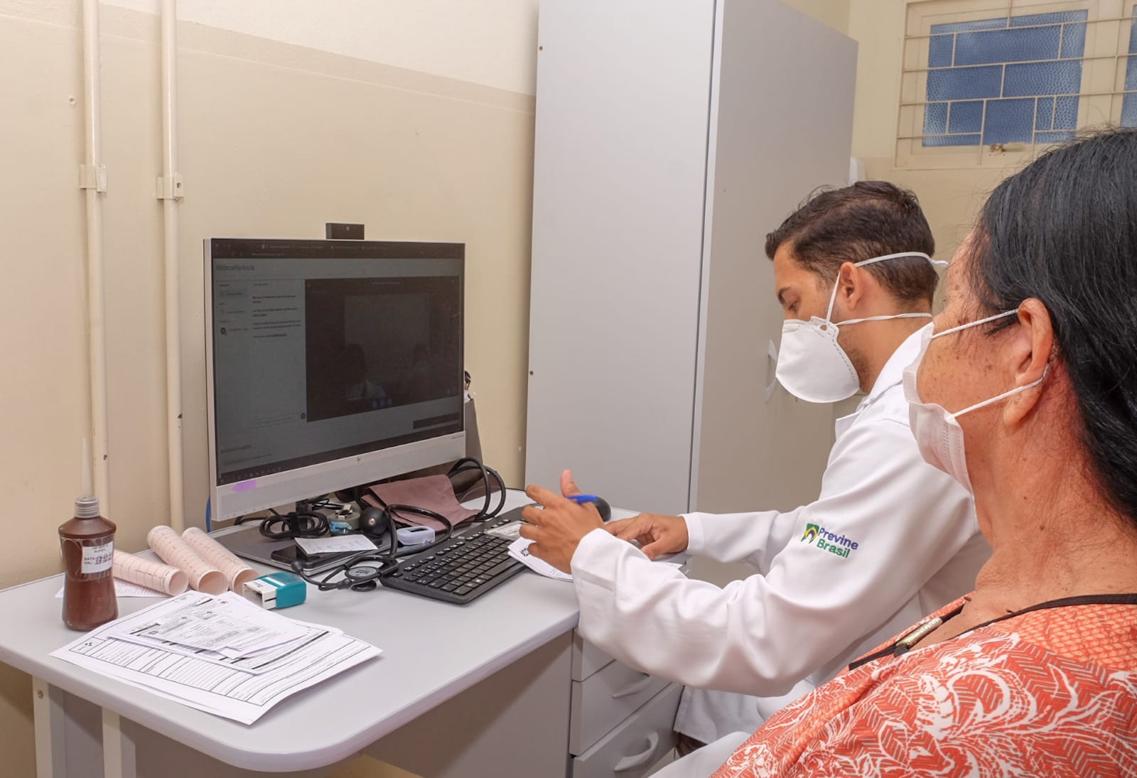 Médico da unidade de saúde durante atendimento a paciente com suporte do especialista. (Foto: Karine Matos/PMCG)