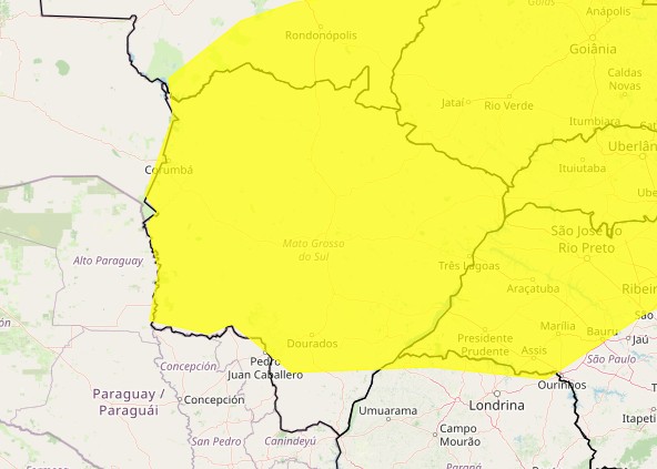 O Instituto Nacional de Meteorologia (Inmet) emitiu nesta quinta-feira (20) um alerta amarelo para baixa umidade do ar em todos os 70 municípios de Mato Grosso do Sul. O aviso começou às 12h e é válido até às 19h, com índices previstos entre 30% e 20%, considerados de risco à saúde. O nível está bem abaixo do limite ideal recomendado pela Organização Mundial da Saúde (OMS), de 60%.