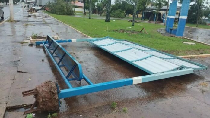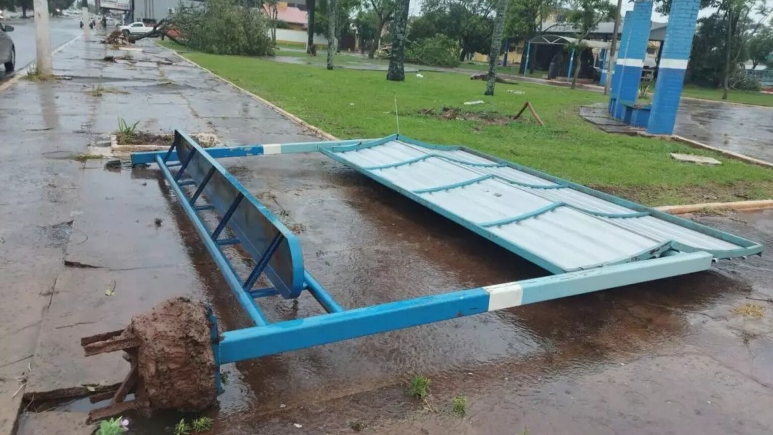 Em Coronel Sapucaia, o temporal também deixou um rastro de destruição, com quedas de árvores, inclusive, um veículo foi atingido pelos galhos de uma dessas. Em outra ocorrência, parte da cobertura de uma borracharia, localizada na Vila Nova, foi arrancada pelo vento.