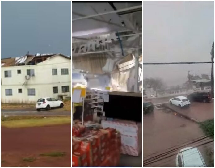 Vídeos compartilhados nas redes sociais mostram telhas sendo levadas pela força do vento na Escola Estadual Dom Bosco. Parte do telhado das Lojas Americanas, no centro da cidade, também desabou.