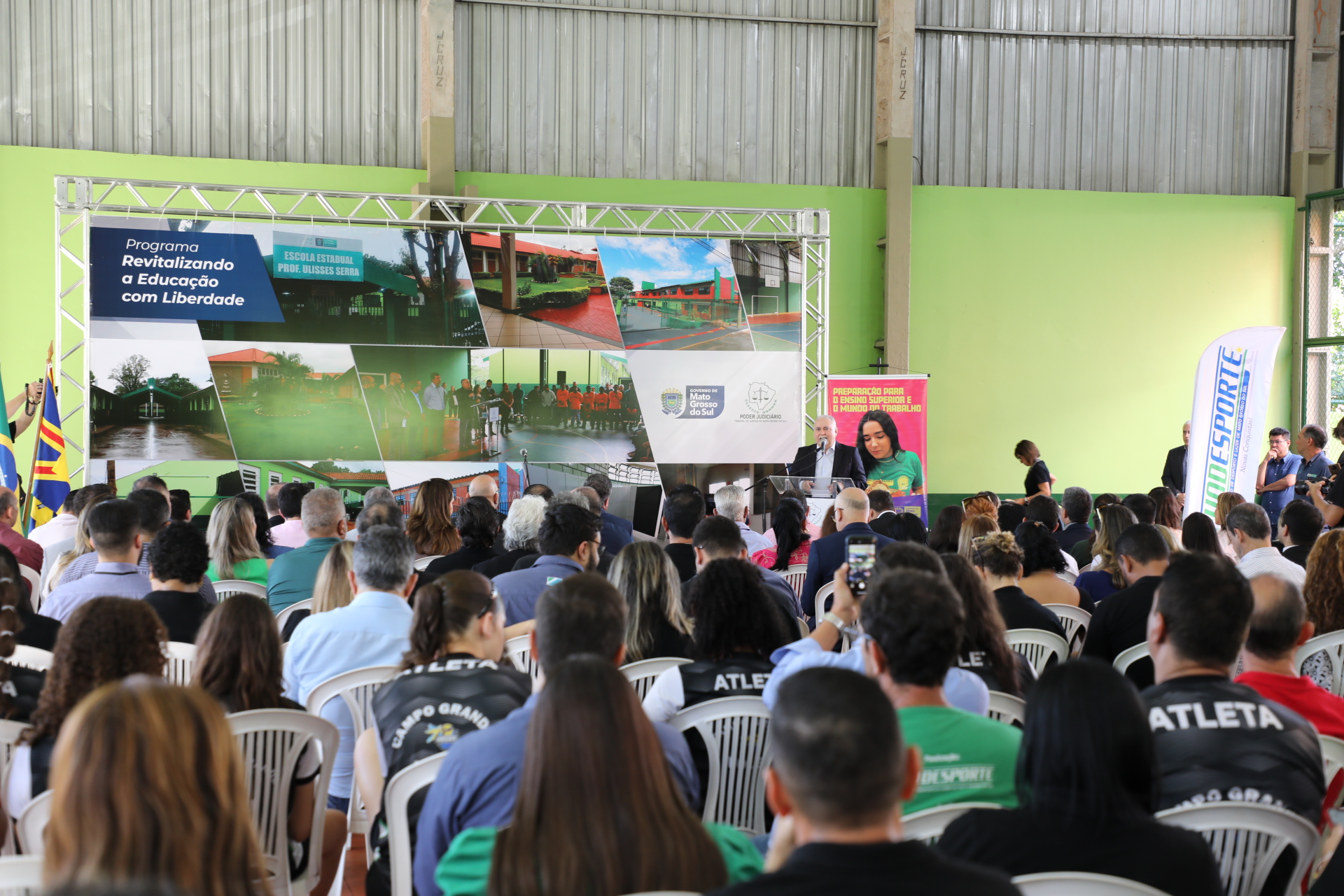 Na manhã desta segunda-feira (22) o presidente do Tribunal de Justiça de Mato Grosso do Sul, Des. Sérgio Fernandes Martins, e o Governador do Estado, Eduardo Riedel, inauguraram a 15ª reforma pelo programa do Poder Judiciário estadual “Revitalizando a Educação com Liberdade” que destina o dinheiro de presos e o trabalho prisional para reformar escolas da rede estadual de ensino. De forma inédita, a antiga E.E. Riachuelo foi a escola contemplada, que foi transformada no primeiro Centro de Referência de Esporte e Cultura Escolar do Estado, localizado no bairro Cabreúva.