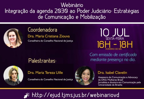 Ao longo de duas horas, o evento, intitulado “Integração da Agenda 2030 ao Poder Judiciário: Estratégias de Comunicação e Mobilização” será coordenado pela conselheira do Conselho Nacional de Justiça (CNJ), Maria Cristina Ziouva, e terá como palestrantes a também conselheira do CNJ, Maria Tereza Uille, e a assessora de comunicação e advocacy da ONU Mulheres Brasil, Isabel Clavelin.