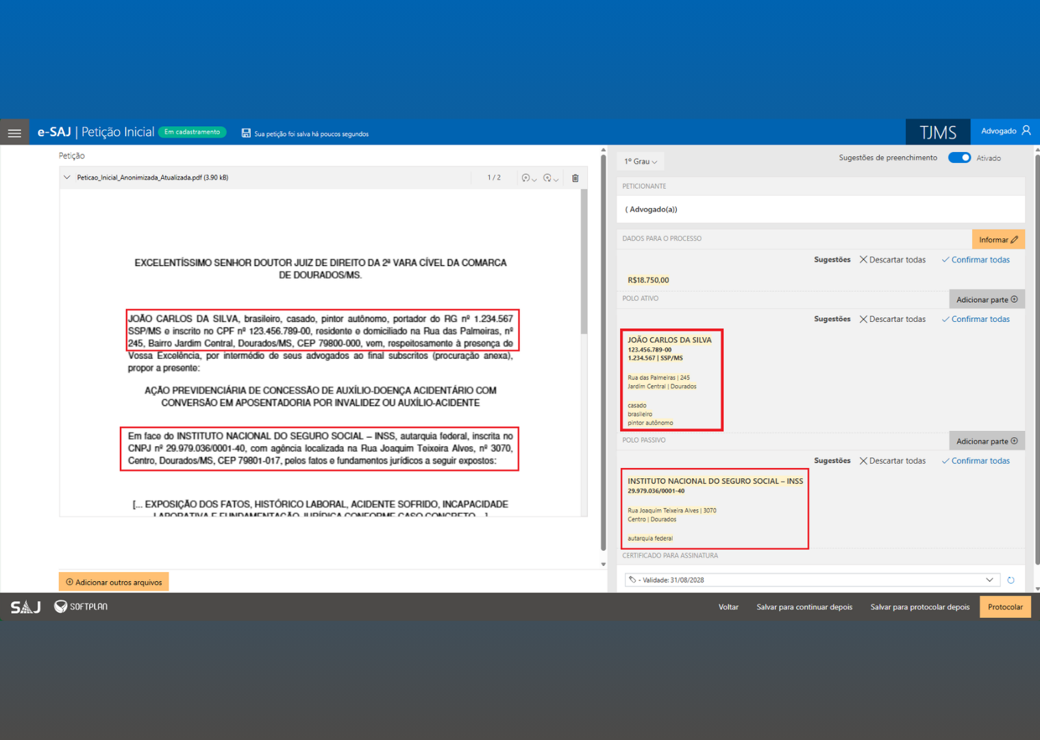 Com a funcionalidade de IA, ao anexar o arquivo da petição inicial em formato PDF ou similar, o sistema realiza automaticamente a leitura do documento e apresenta sugestões de preenchimento dos campos obrigatórios, funcionando como um assistente inteligente que apoia o usuário durante o protocolo da ação. A tecnologia é capaz de identificar dados essenciais das partes, sejam pessoas físicas ou jurídicas, além de informações processuais relevantes, como o valor da causa.