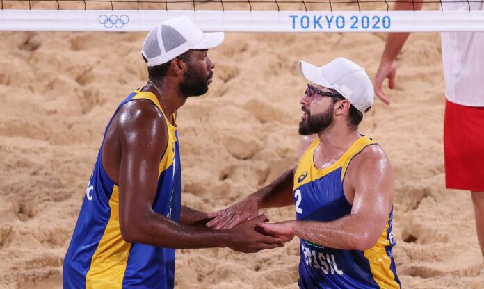 A dupla brasileira de vôlei de praia Evandro e Bruno Schmidt venceu, de virada, nesta sexta-feira, os poloneses Bryl e Fijalek, com parciais de 19/21, 21/14 e 17/15. O confronto foi realizado no Parque Shiokaze, na capital Tóquio. Com este triunfo, eles asseguraram a classificação para as oitavas de final na Olimpíada.