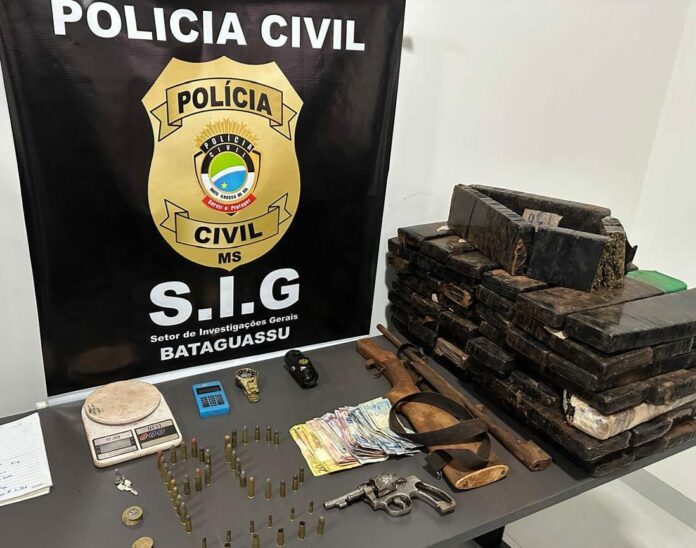 As buscas resultaram na descoberta de um esconderijo oculto na terra, onde foram apreendidas 44 kg de maconha, um revólver calibre .38, uma espingarda calibre .22 e diversas munições de calibres variados de uso permitido e restrito.
