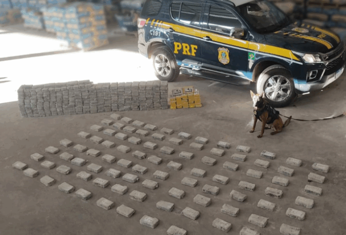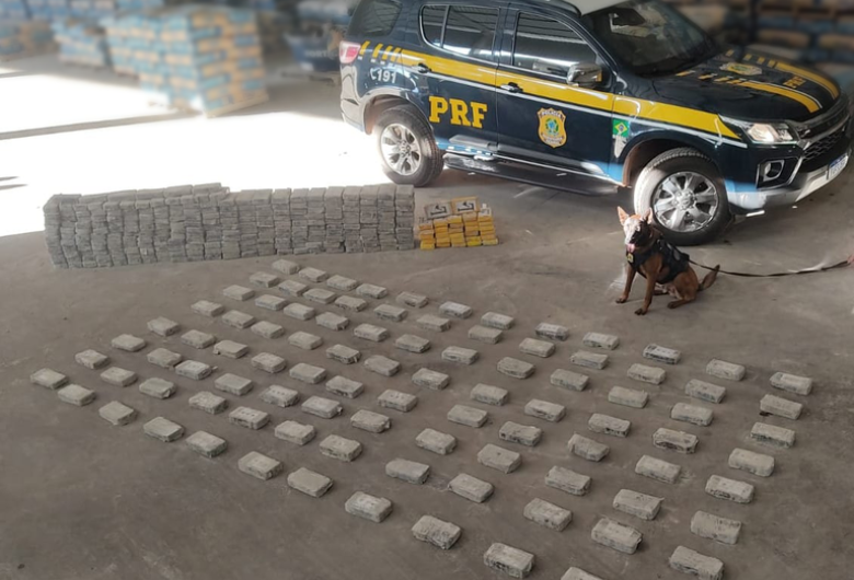 O caminhão estava carregado de cimento, com isso, foi solicitado o apoio da equipe do canil da PRF para a revista. Os cães de faro confirmaram a presença de droga na carga.