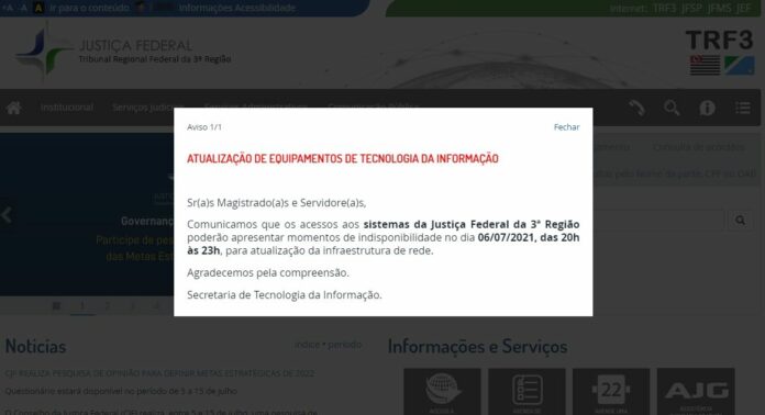 TRF3 lança aviso de indisponibilidade de sistema na noite desta terça-feira
