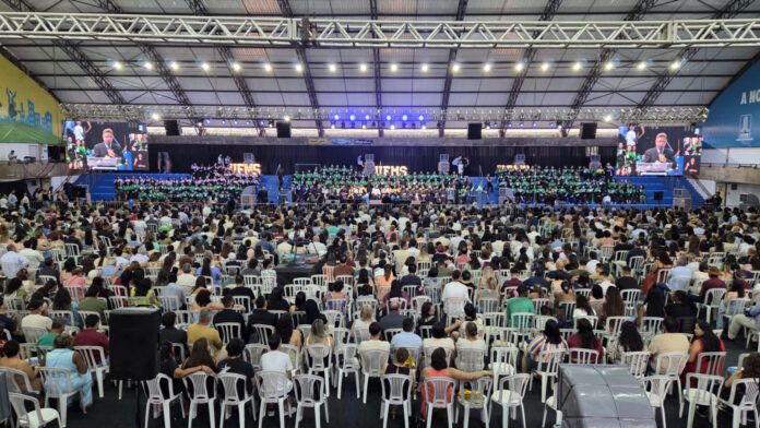 Nesta sexta-feira, 12, 577 concluintes do Instituto Integrado de Saúde (Inisa) e das faculdades de Ciências Farmacêuticas, Alimentos e Nutrição (Facfan); Educação (Faed); Medicina Veterinária e Zootecnia (Famez); Artes, Letras e Comunicação (Faalc); Direito (Fadir); Engenharias, Arquitetura e Urbanismo e Geografia (Faeng); e Ciências Humanas (Fach) colaram grau em duas cerimônias no Ginásio Moreninho, na UFMS de Campo Grande. Centenas de familiares, amigos, professores e técnicos-administrativos prestigiaram a realização do sonho dos formandos de 34 cursos de graduação. A solenidade foi transmitida ao vivo no canal da TV UFMS.